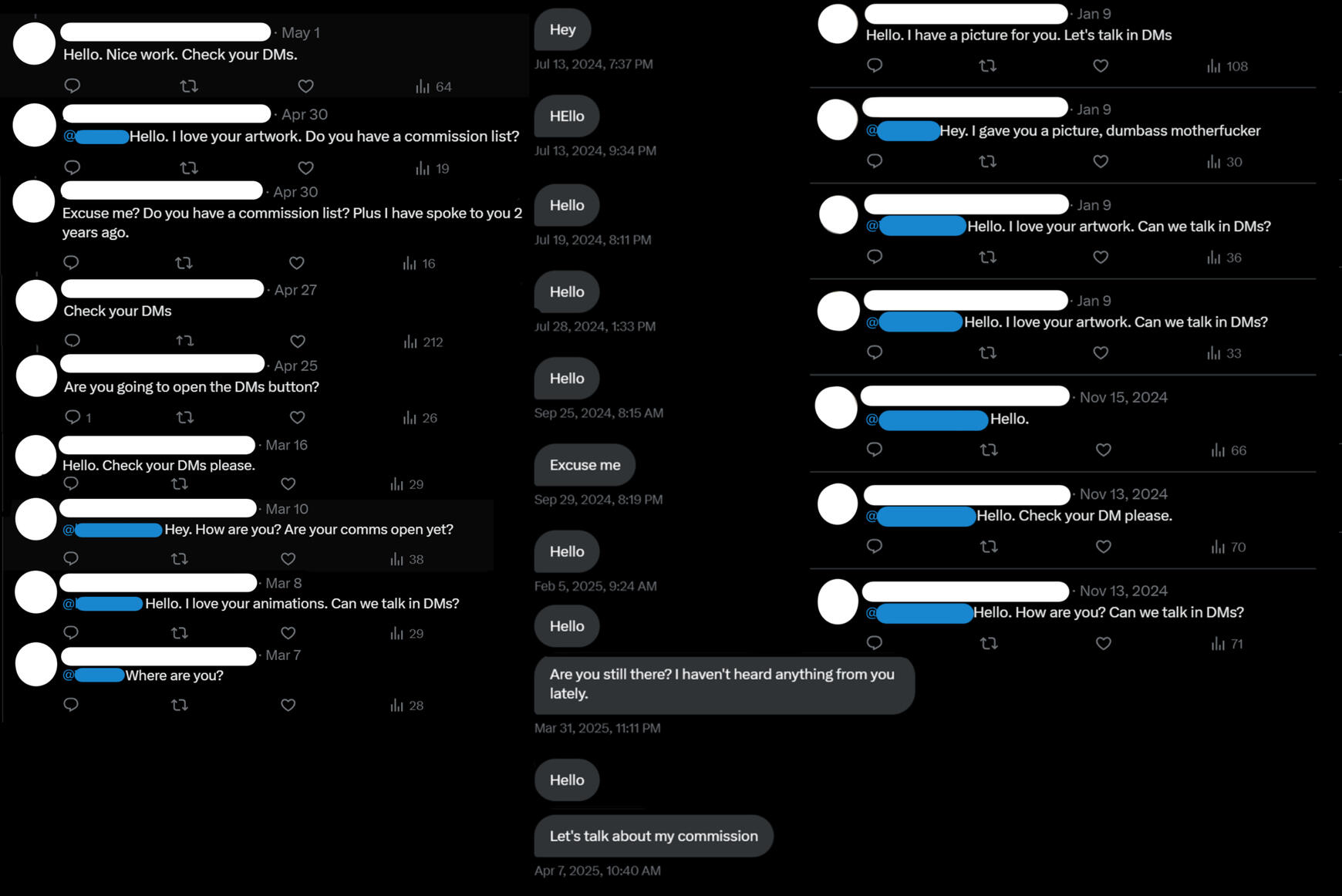 You are known to go around asking other artists for commissions and never committing to them or to try and get free art, extort, or drag certain artist's names through the mud